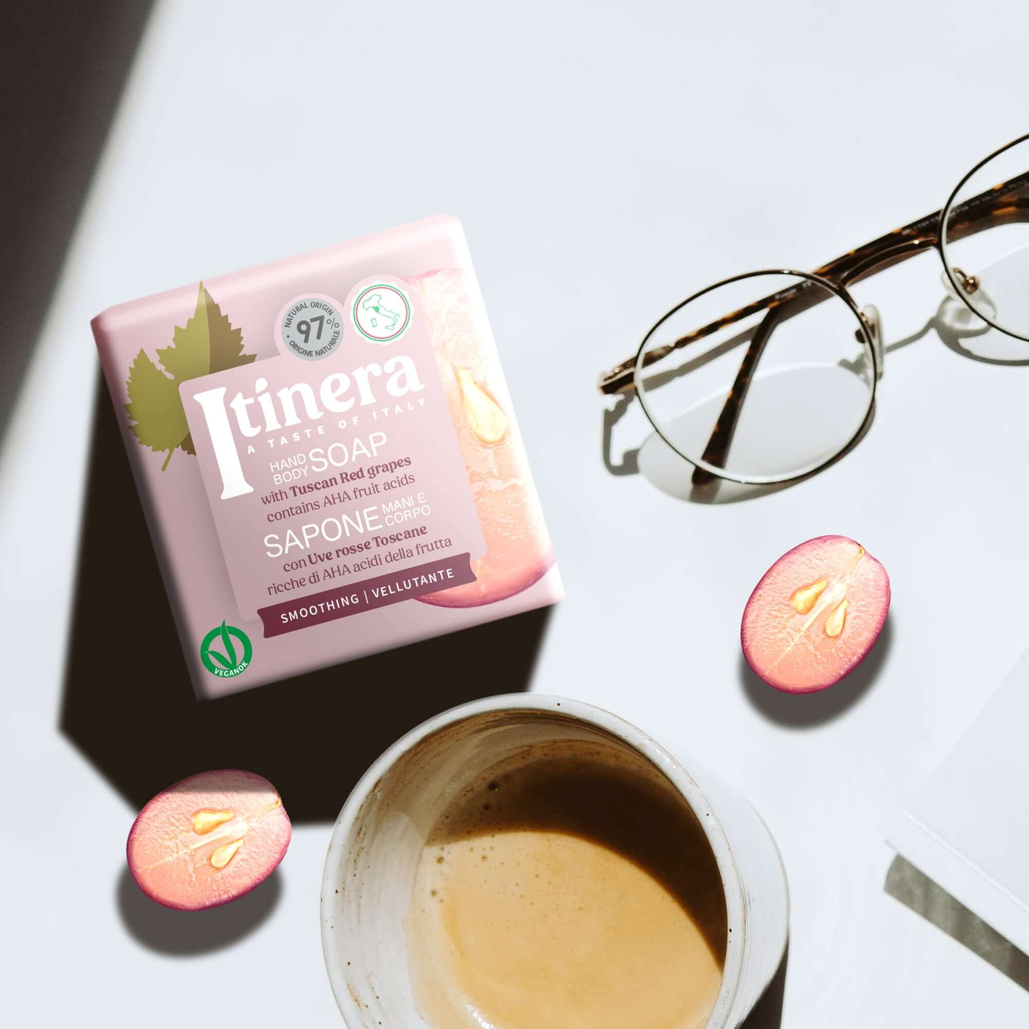 Die roten Weintrauben aus den Weinanbaugebieten der toskanischen Hügel sind reich an wertvollen Extrakten, die für ihre stärkenden, regenerierenden und lindernden Eigenschaften bekannt sind. Diese Seife enthält zusätzlich Äpfel aus dem Trentino, Zitronen von der Amalfiküste und Weizenkleie aus der Poebene, die die Haut mit nährenden und schützenden Inhaltsstoffen versorgen.