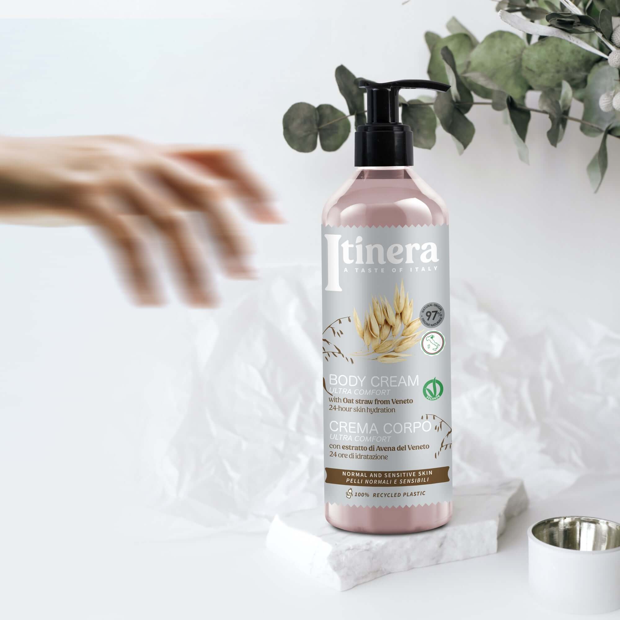 Der Hafer, der für diese Körpercreme verwendet wird, stammt aus Venetien und wird seit Jahrhunderten für seine schützenden und pflegenden Eigenschaften in der Hautpflege genutzt. Heute entfaltet er seine wohltuende Wirkung in der Ultra Komfort Körpercreme.