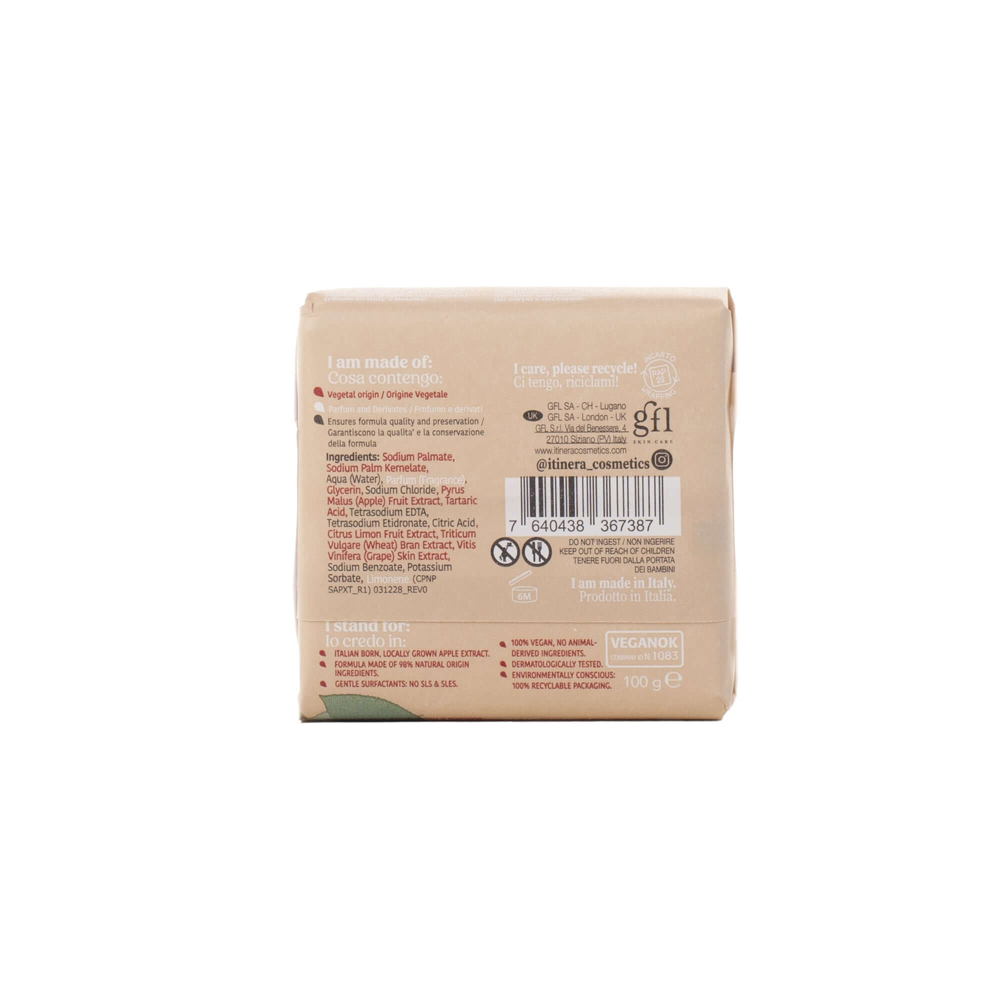 Diese Hand- und Körperseife basiert auf einem pflanzlichen Komplex aus Apfel, Traubentrester, Zitrone und Weizenkleie, der für seine schützenden und regenerierenden Eigenschaften bekannt ist.
